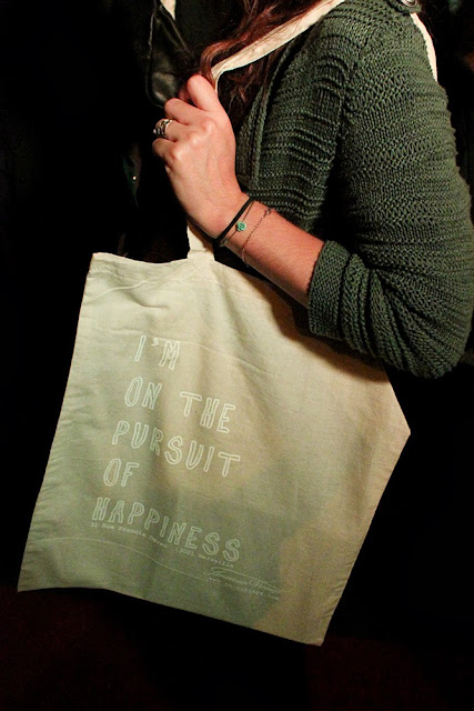 On s’attendait à une petite soirée sympa à l’intérieur du magasin. Eh bien non. Tapis rouge, buffet de part et d’autre sous chapiteau, serveurs… On a mieux compris pourquoi c’était une soirée privée, sur invitation. Une fois l’entrée franchie, un joli tote bag nous est remis. « I’m on the poursuit of happiness ». Parfait pour nous! On peut aussi le faire personnaliser chez le graphiste/peintre.