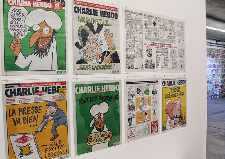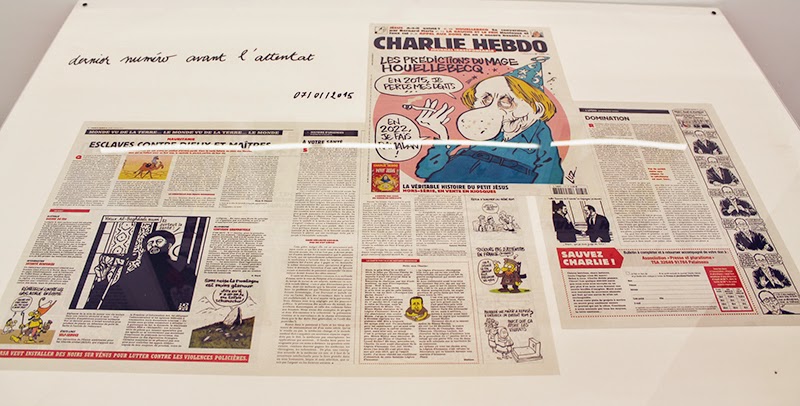Quelques unes attirent plus l’attention que d’autres dans l’exposition, notamment celle de septembre 2012 où le journal est vide suite à une vive polémique autour d’une caricature du prophète. Les pages du dernier journal, de ce fameux 7 janvier 2015, sont évidemment poignantes.