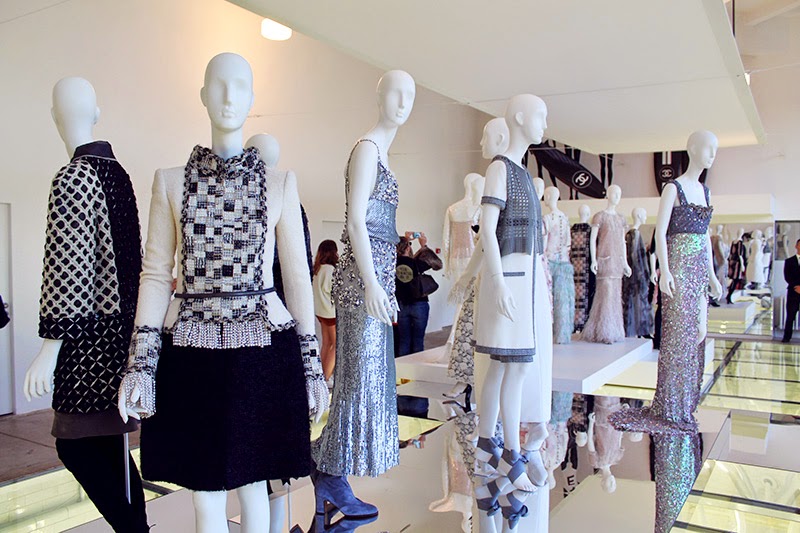 La piscine, pièce préférée d’un très grand nombre de visiteurs de la Villa, abrite l’exposition « Chanel Innovation ». Les jeux de miroir et la lumière mettent en valeur la dizaine de pièces aux tons sobres et aux détails des plus minutieux. La dentelle de Calais se mêle au néoprène, une robe de soirée se porte avec des baskets… La Maison sait prendre des risques et se réinventer. « Chanel Innovation » porte bien son nom.