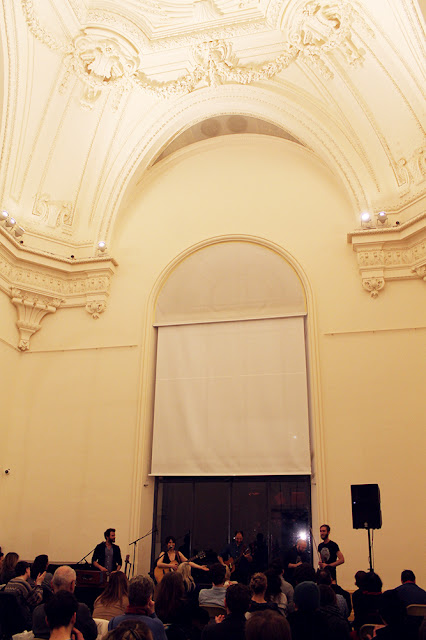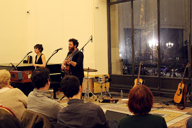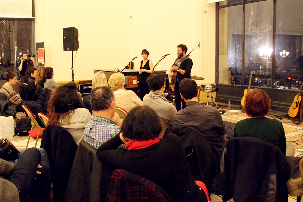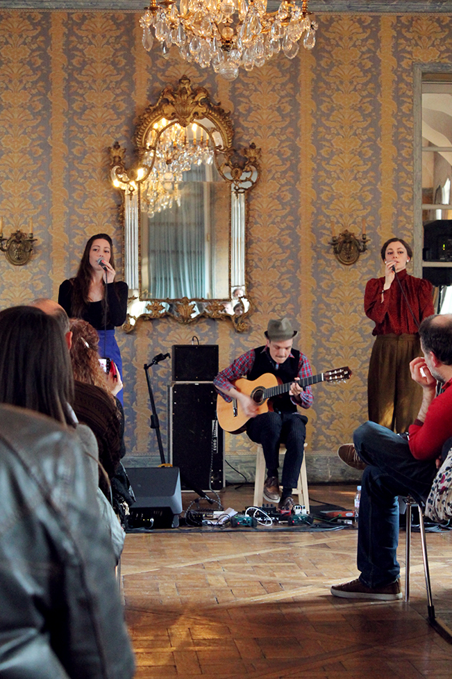 Après un goûter à l’Institut Suédois, direction le magnifique Musée Carnavalet présentant les souvenirs de la Révolution française. C’est au milieu de portraits, de quelques sculptures et sur fond de vieille tapisserie que se produit Sparky in the Clouds. Le guitariste français et les deux soeurs anglaises (from Devon, comme Coldplay ou encore The Hobbit nous disent-elles en riant) nous transportent sur un petit nuage de Dublin à Berlin avec leur folk britannique. Ils ont fait les premières parties de Yodelice, La Maison Tellier ou encore Fatoumata Diawara. Prometteur !