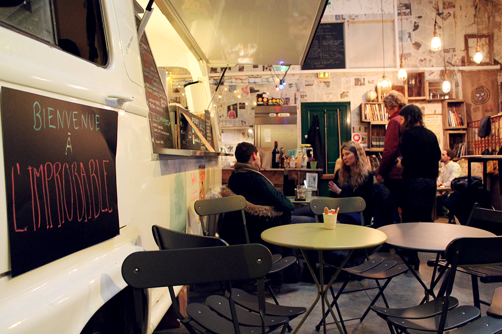 Ouvert depuis mars 2015, on y vient pour manger des pistolets (sandwichs belges), prendre le goûter avec de très bons biscuits/pâtisserie (le brookie est une tuerie !), papoter, bruncher, même prendre l’apéro… Le tout dans une ambiance recup’ avec du journal en guise de tapisserie, des caisses en bois comme étagères déco, guirlandes pour éclairer, des plantes, du mobilier de jardin, un van pour le foodtruck…L’Improbable porte bien son nom avec son esprit bohème et alternatif complètement inattendu dans le quartier huppé du Marais. C’est un lieu surprenant qui séduit facilement. Le personnel est sympa, les produits sont frais, les plats et gourmandises faits maison, les prix.. parisiens mais passe encore. On s’y sent bien, à la cool.