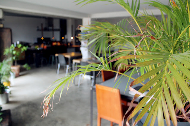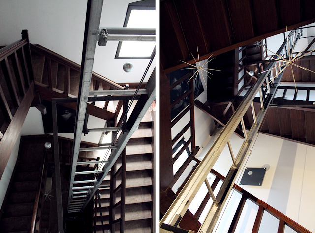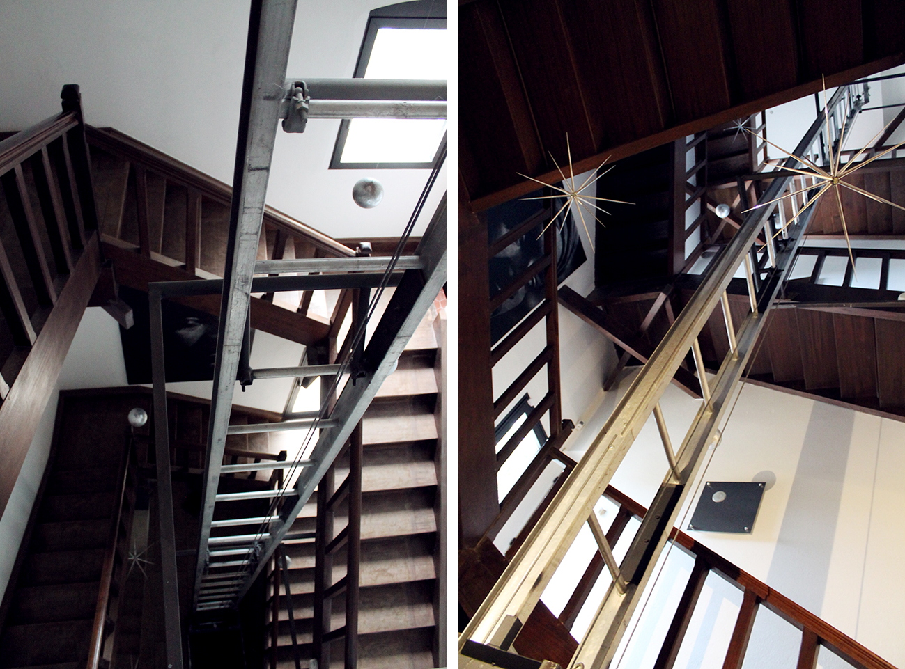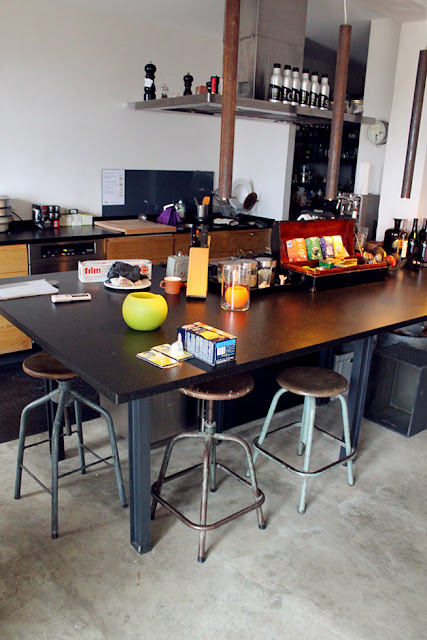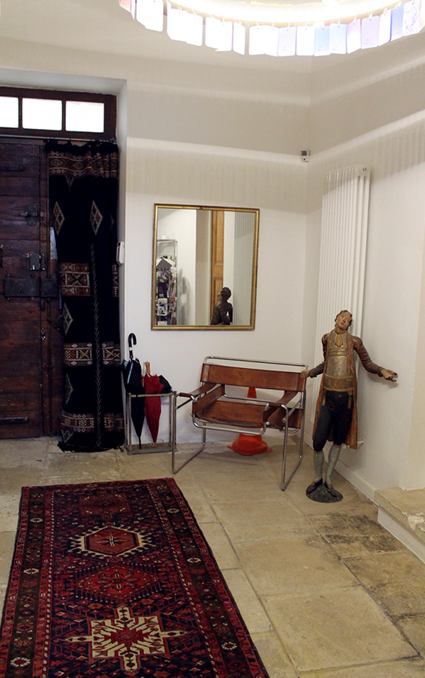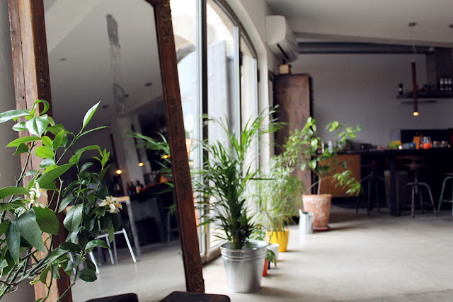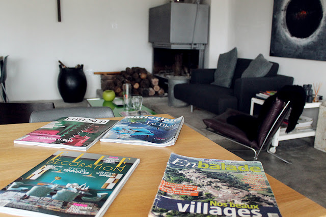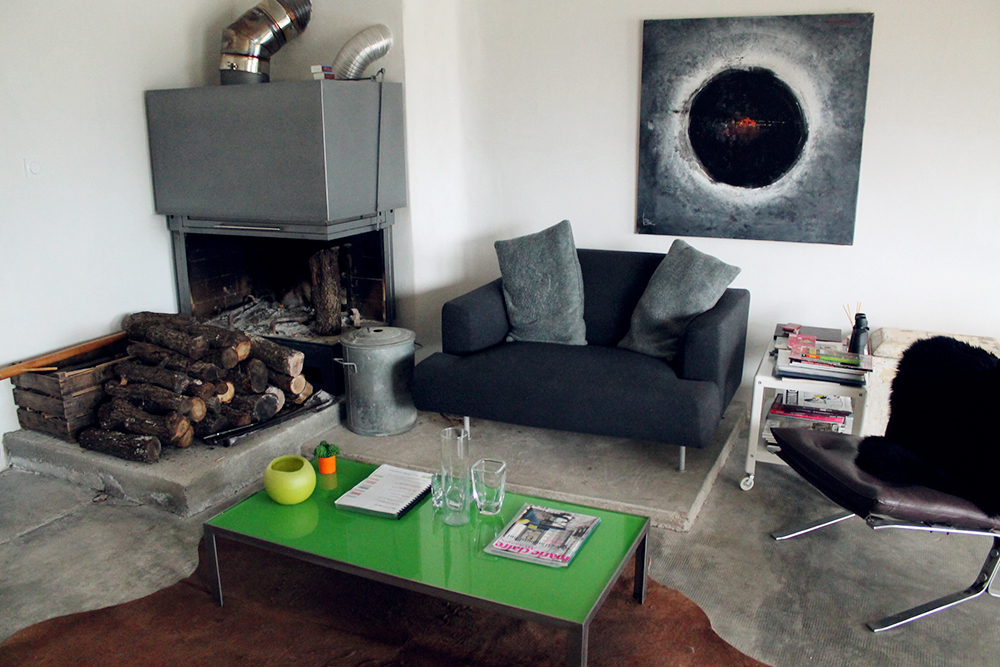 Après avoir descendu le magnifique escalier digne d’un manoir (il craque vraiment comme dans les films qui se passent dans un manoir), vous avez accès à la cuisine. Peut-être ma pièce favorite de cette bâtisse. Des plantes,un immense vieux miroir, une cheminée moderne avec une peau de bête devant, des suspensions imaginées par Isabelle, un sol en béton… Vraiment canon. C’est ici qu’on prend le petit déjeuner (inclus dans le prix de la chambre) fait maison. Fin février, le couple de propriétaires étant en voyage, c’est Patrick, un ami du couple qui nous a accueillis et préparé de très bonnes crêpes à la farine de châtaigne et vanille. Pain trop bon, muesli, confitures maison par Isabelle (celle aux Reines Claude/cannelle est excellente!)… Le régal.