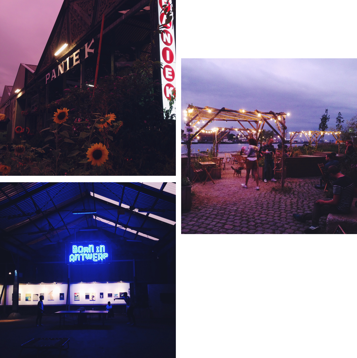 Mon préféré a été le Paniek. Il s’agit du quartier général de Born in Antwerp, au bord du bassin de Kattendijk. Expos, concerts, petit ciné, trampoline (!!), table de ping-pong, bar stylé avec la bière locale à 1€80 (!!)… Le bois est omniprésent dans ce lieu d’acier, la vue est top, les plantes et guirlandes habillent l’extérieur. S’il n’y avait pas autant de choses à tester, on y serait retournées tous les soirs.