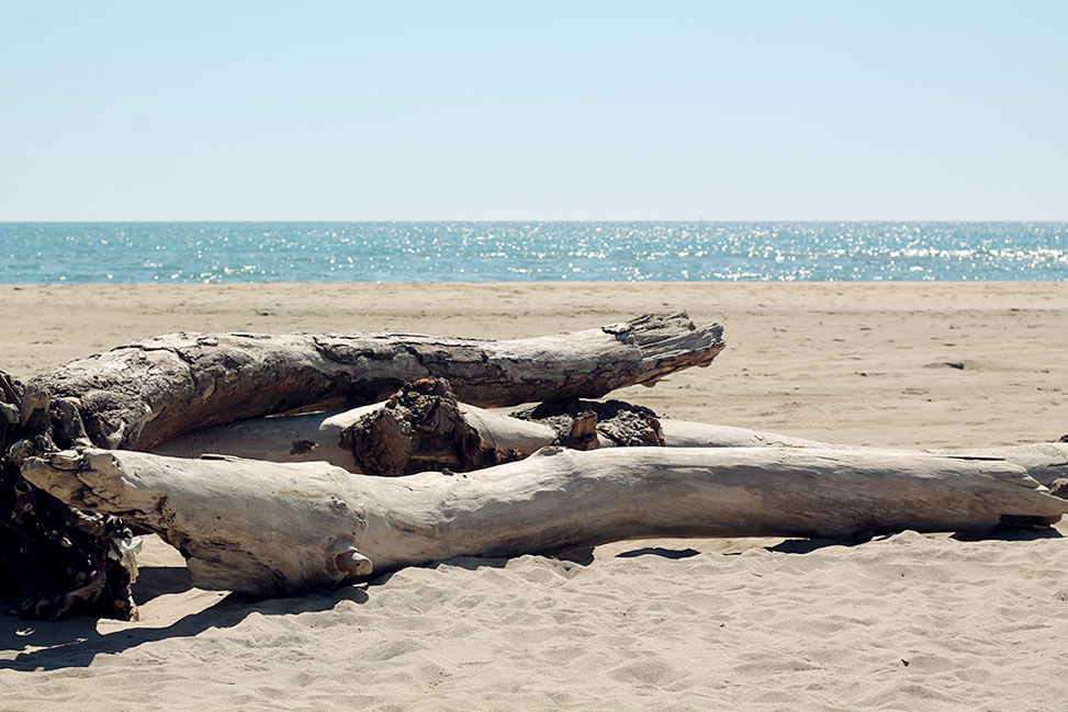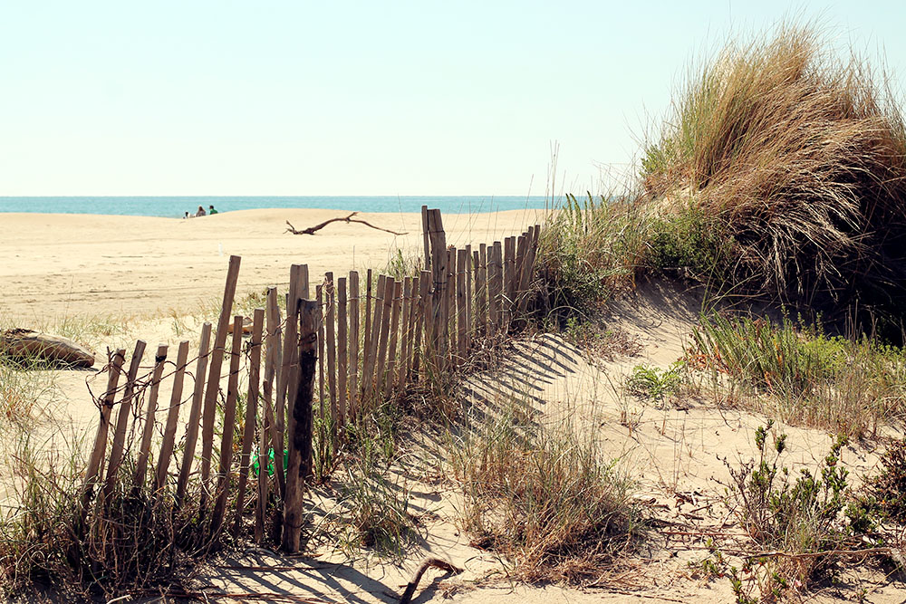 En longeant les marais, on aperçoit les premiers flamants roses. Puis, la plage. Une immense plage de sable fin comme on en voit peu dans les Bouches-du-Rhône et le reste de la Riviera. On se croirait presque dans le Sud-Ouest. Souvenirs des vacances à Port-Leucate lorsque j’étais enfant…