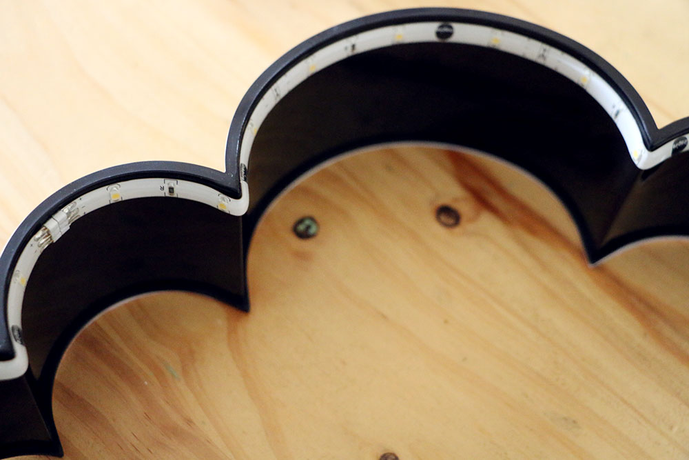 2. Une fois la bonne longueur trouvée, enlevez le petit papier derrière le ruban et collez le tout autour du nuage (ou quelconque autre forme que vous souhaitez illuminer).