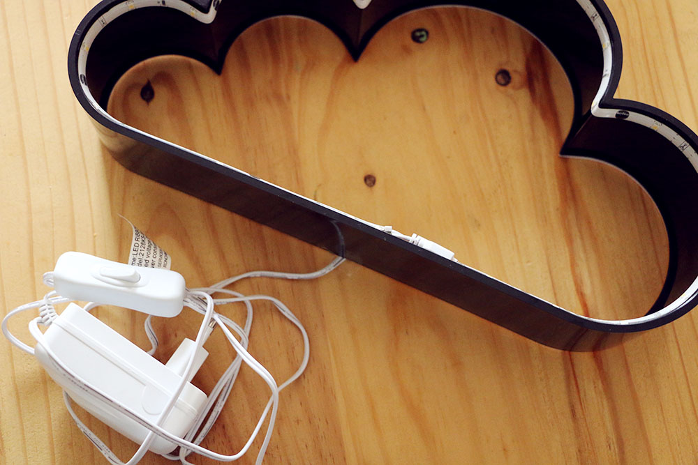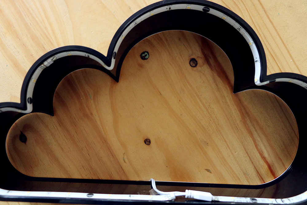 Par chance, je tombe sur deux étagères en forme de nuage chez Tiger. La forme parfaite pour la lampe qui allait éclairer notre chambre. Ca tombait également bien car j’ai écumé les magasins de bricolage et créatifs, et aucun cercle en bois n’était adapté à la fabrication d’une lampe.
