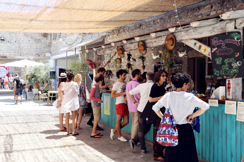 On y boit des bières, des citronnades, on y mange des tacos (attention, l’aubergine du veggie est trèèèèès relevée. Info capitale pour les gens comme moi.). C’est le bon spot pour déjeuner ou se poser entre deux expos. Un poil cher, mais comme tout ce qui est éphémère et stylé… Mais ya des brumisateurs, et ça, ça n’a pas de prix !