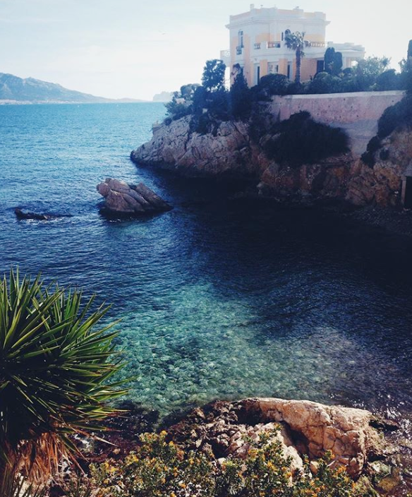 À partir du Vieux-Port, la Corniche débute avec la plage des Catalans. Très prisée en été (et du coup pas mal évitée des marseillais), il s’agit de la plage la plus proche du centre ville. Depuis bien deux ans maintenant un banc bordant la mer, similaire à celui qu’on retrouve le long de la Corniche a été installé au niveau des rochers. Lorsque je n’habitais qu’à une dizaine de minutes à pieds, j’adorais venir y contempler la mer, bouquiner ou (encore une fois!) prendre le petit dej’ au calme. Hors saison, c’est aussi la plage la plus pratique pour se baigner à sa pause dej’.