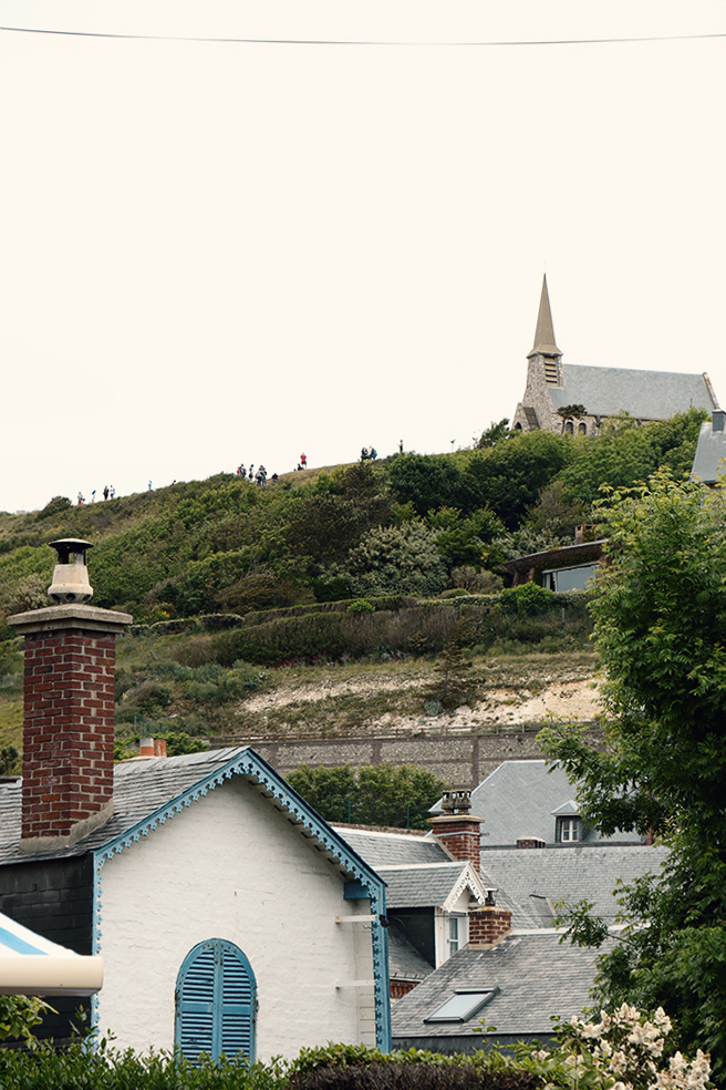 A seulement 10mn à pied du Donjon, il y a la petite ville d’Etretat et la plage. Pour découvrir les falaises, nous choisissons le côté droit, direction Notre-dame-de-la-Garde. Ok je viens en Normandie mais il ne faut pas non plus trop me dépayser 😉 Heureusement, ça monte moins que pour aller à la Bonne Mère !