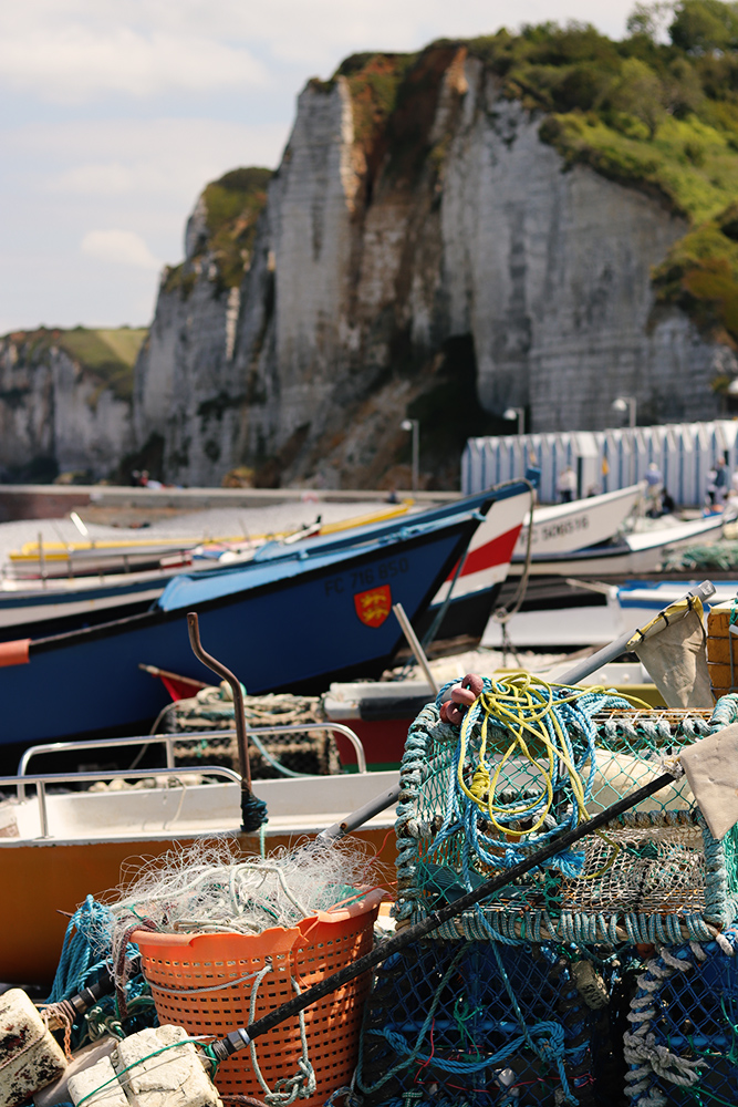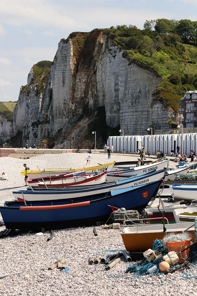 On traverse les jolies ruelles du village avant d’arriver sur la plage. Une fois sur les galets, Yport continue de charmer. Par sa falaise que l’on peut prendre le temps de découvrir, car moins vue et revue que celle d’Etretat (même si en vrai, ça n’a rien à voir!), par ses petites cabanes colorées ajoutant une nuance de bleu supplémentaire au paysage, par ses petits bateaux de pêche, par ses petites cabanes à crêpes, à souvenirs… On ne peut pas rester insensible à l’authenticité d’Yport. Un vrai coup de coeur !