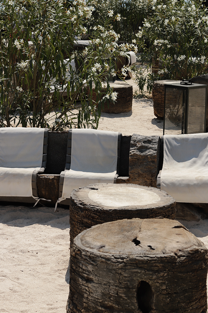 Oliviers centenaires, voiles blancs qui volent au gré de la brise marine, odeur de pins, mobilier lounge creusé dans le bois… Le lieu est magnifique ! On n’aurait pas fait meilleur décor pour un mariage bohème au bord de mer.
