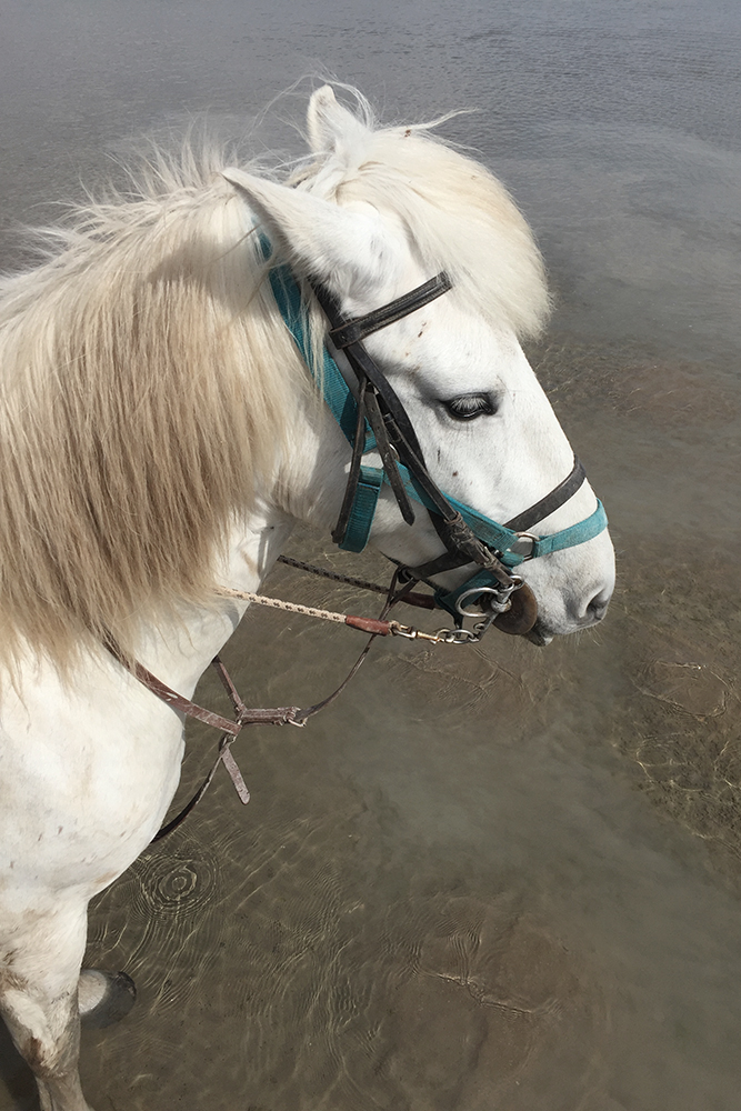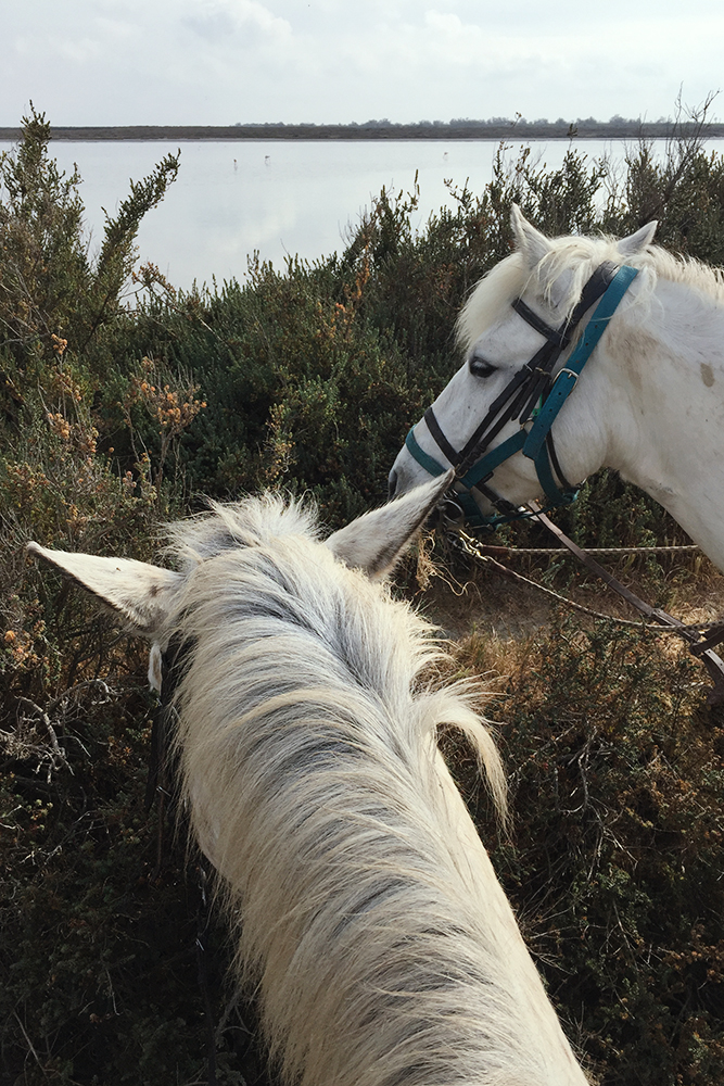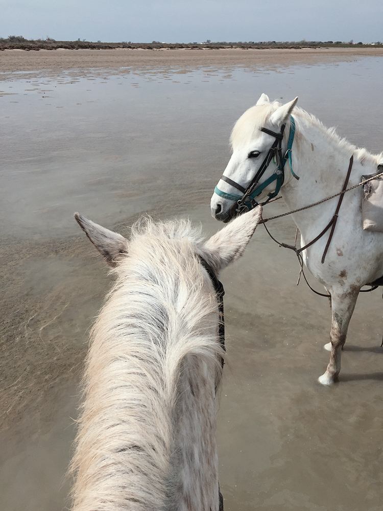 Ce jour-là, une journée de semaine en avril 2019, Clara, Vanessa et moi sommes seules avec Maëlle. Nous faisons la balade de 2h, idéale pour voir la diversité des paysages des Saintes-Maries-de-la-Mer. On traverse la route en face de l’écurie pour emprunter un petit chemin qui nous emmène dans les marais. Puis on trotte vers la mer.