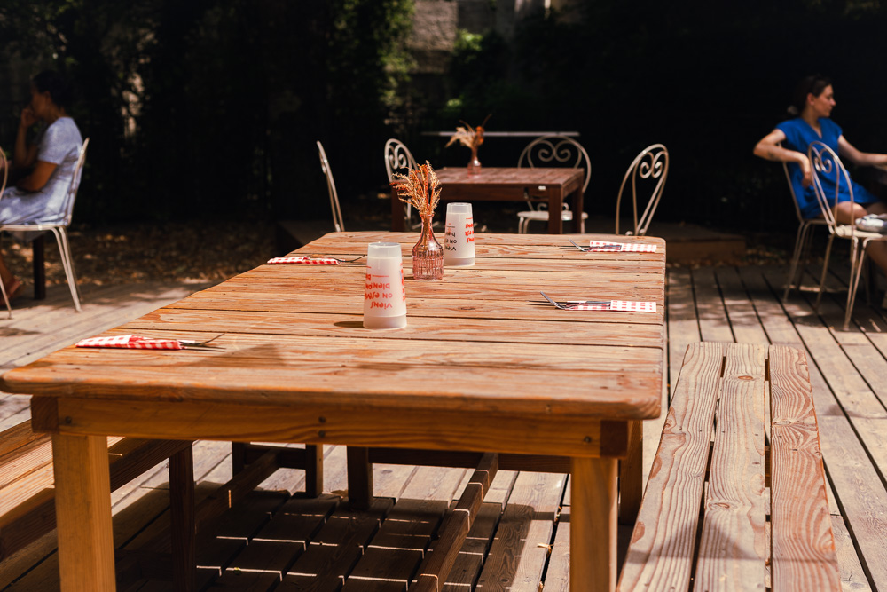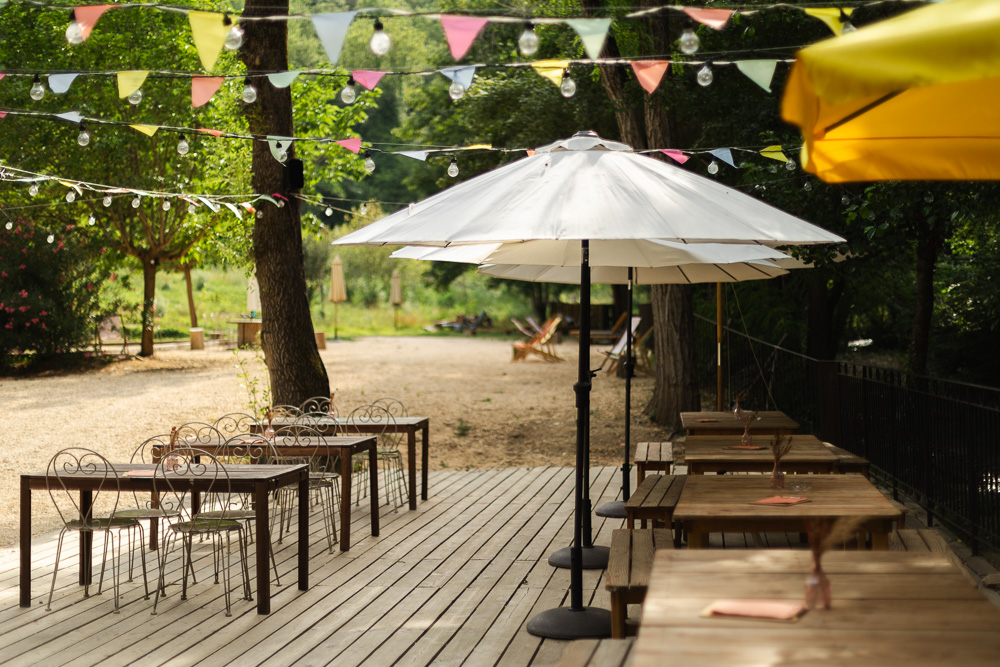 Montrieux le Hameau se suffit à lui-même. En bas, en bord de rivière, se trouve la guinguette. On y cuisine des plats simples et créatifs avec des produits locaux voire même du potager. Boulodrome, chaises longues sont là pour l’avant ou après repas. Un peu plus haut, un premier potager et l’étang dans lequel on peut se baigner.